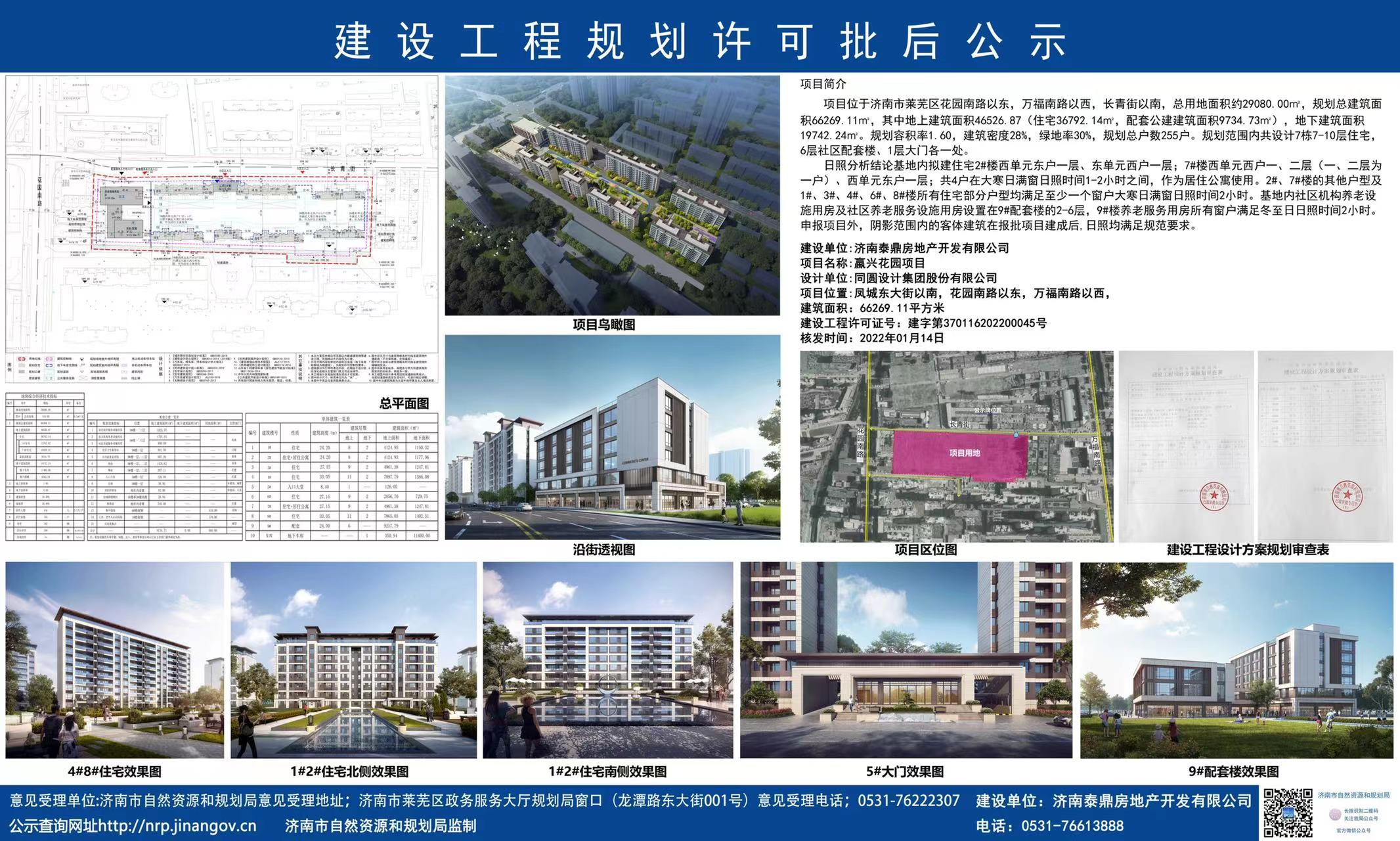 今日,小编从济南市自然资源和规划局网站了解到,嬴兴花园项目建设工程规划许可批后公告,规划总户数255户,共7栋住宅,具体如下: