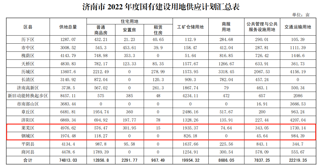 2022年莱芜区、钢城区供地计划如下:莱芜区13宗(5宗商品住宅用地、7宗协议出让的棚户区改造项目以及1宗划拨用地),钢城区3宗(商品商住用地)。