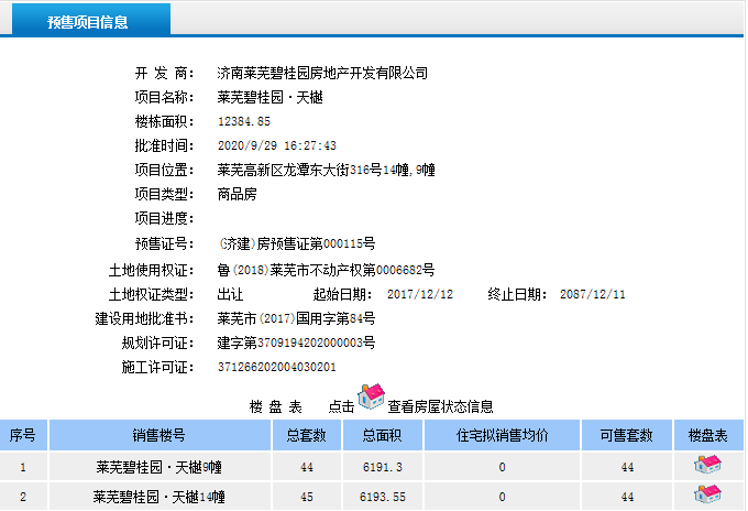 买房看五证,五证齐全才放心。近日,莱芜在线房产小编从商品房信息公示网站了解到碧桂园·天樾项目又有两栋楼获得商品房预售证,分别为9#、14#楼,两栋均为11层洋房,共计88套房源入市。